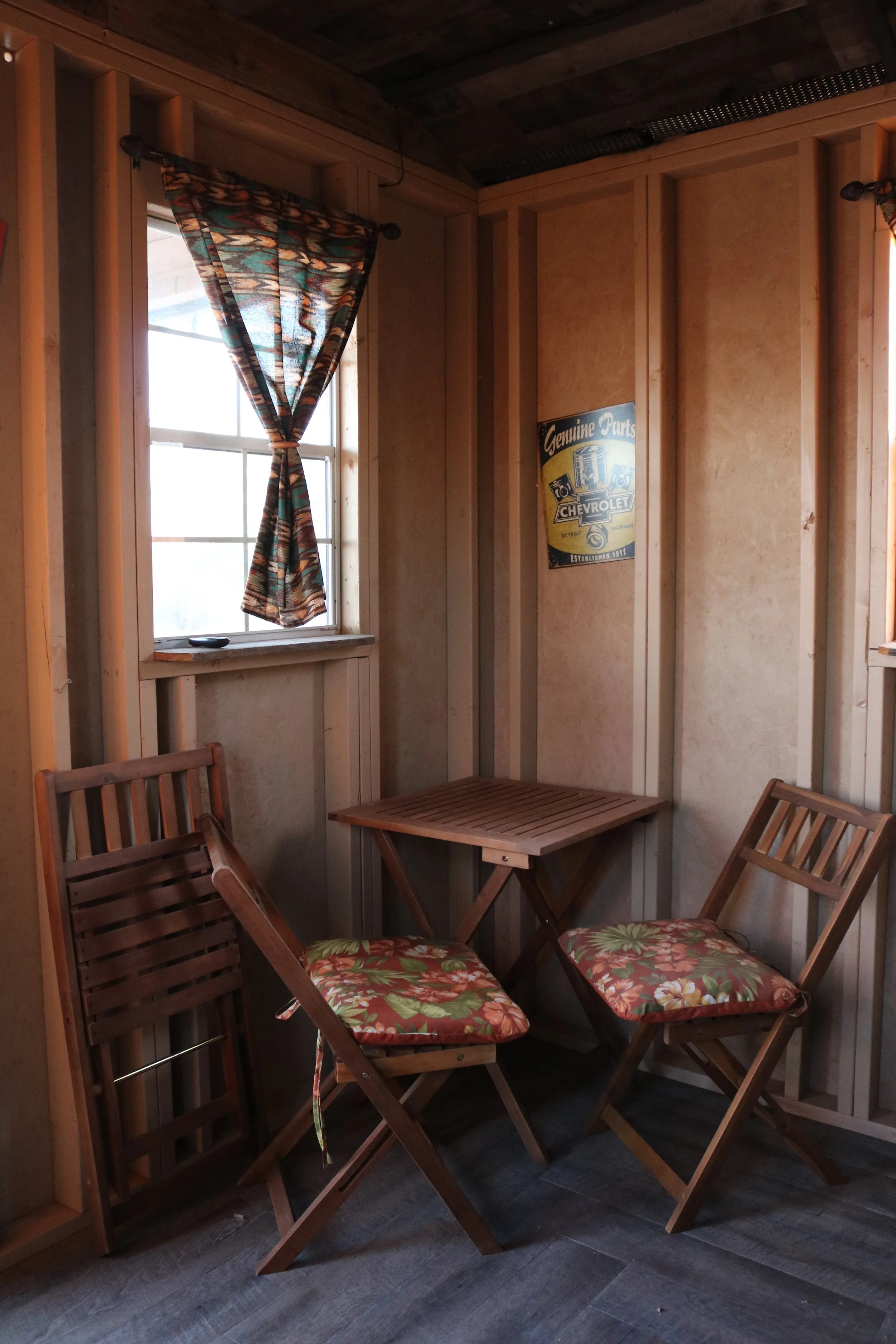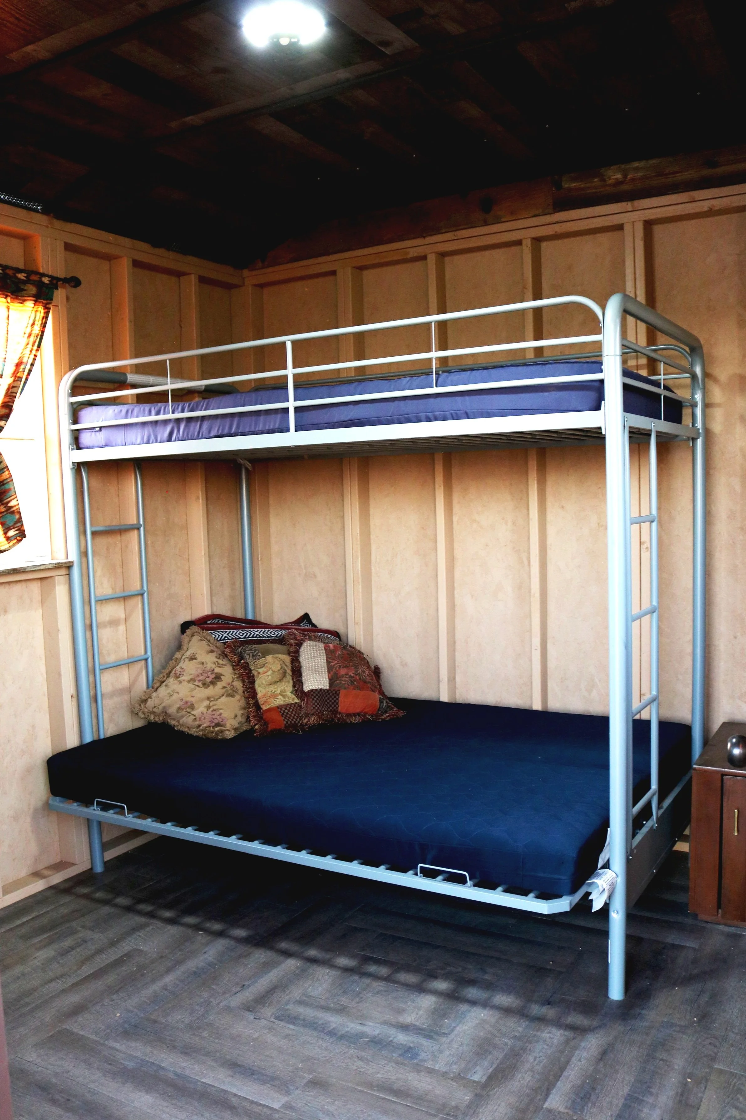 This is the Cannonball. A great space to share. Sleeps up to 3 people. With a twin bed on the top bunk and the lower couch folds out to a full size bed. You can have your table and chairs inside if the weather is inclement or take them out on your porch to enjoy the morning sunrise or the evening sunset. Pillows, sheets and comforters for you to use if you need them. Solar powered lights on the porch and inside, also power for your devices.