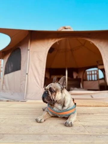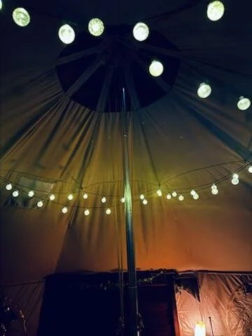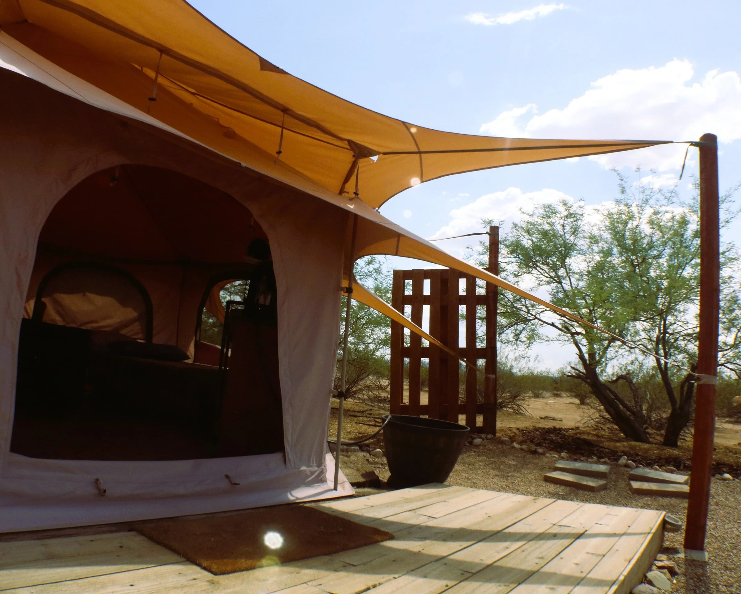 The tent looks deceivingly small from the outside. But once you enter, you will be amazed at the space before you. A 16 foot octagon with side wall heights at 5 foot, and the center pole at 10 foot. Fully carpeted vintage luxury. We hope that you enjoy the plush full size bed complete with pillows and comforters hand made to fit the era.